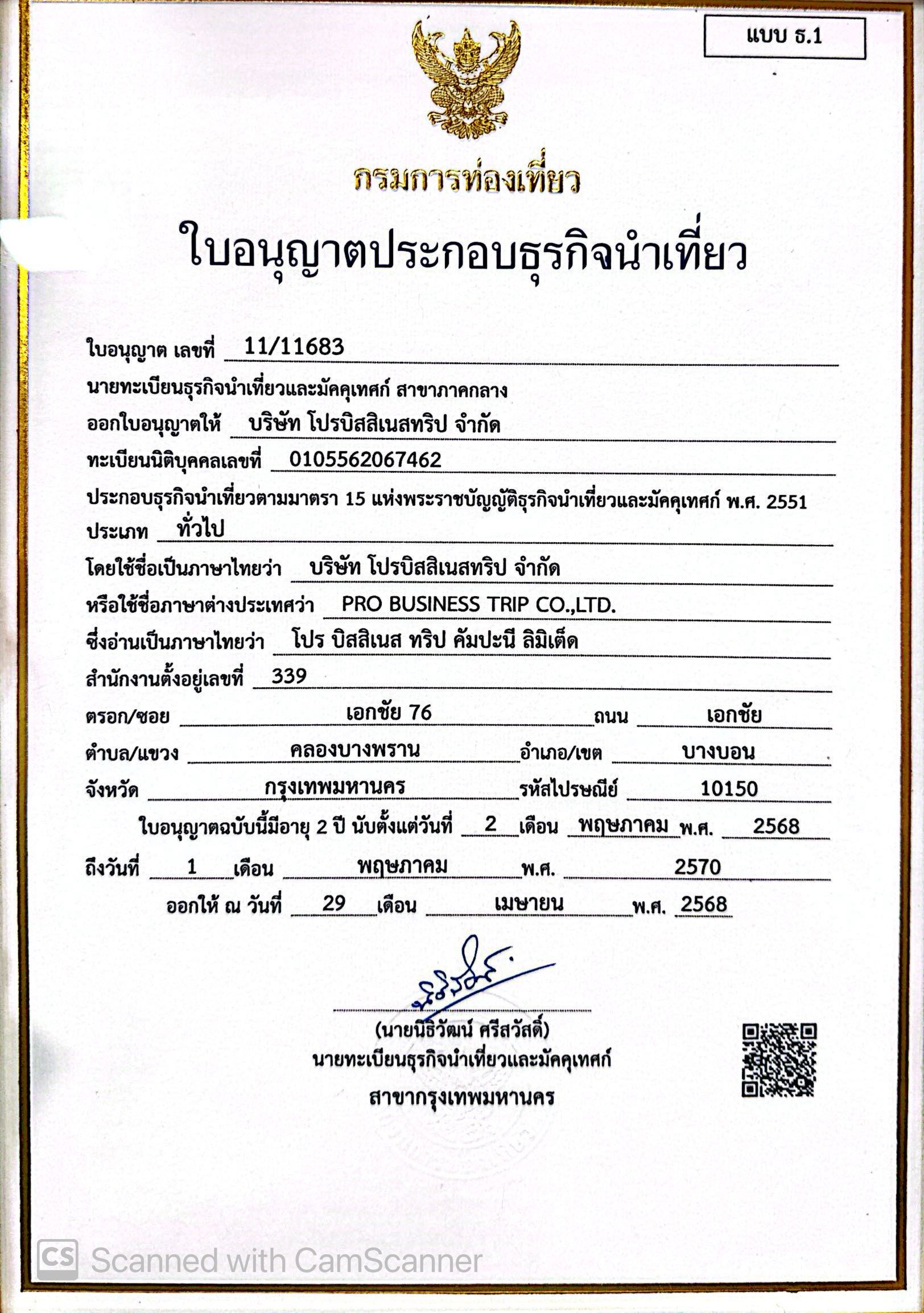 - จัดตั้งในนามของ บริษัทโปรบิสสิเนสทริป จำกัด ใบอนุญาตประกอบธุรกิจนำเที่ยวเลขที่ 11/11683