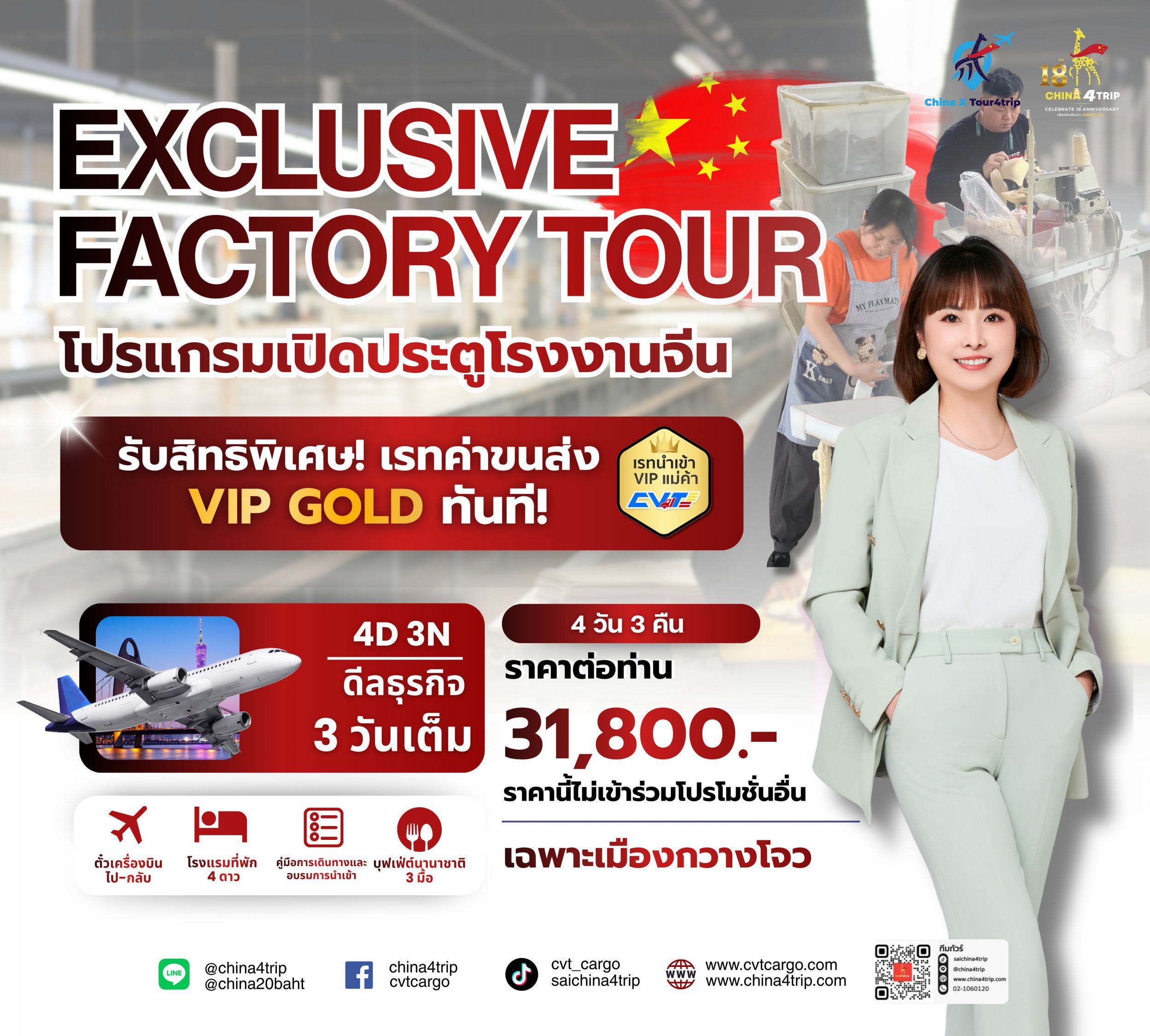 โปรแกรมเฉพาะธุรกิจคุณ มีการนัดหมายเข้าโรงงานจีนหรือดีลสั่งกับโชว์รูมหน้าโรงงานจีน เจ้าของแบรนด์สั่งผลิต สามารถให้ล่ามธุรกิจนำพาท่านไปดีลธุรกิจกับโรงงานในเมืองกวางโจว ตามที่ท่านได้เลือกดีลธุรกิจไว้หรือทางเจ้าหน้าที่โปรแกรมนัดหมายโรงงานให้ใกล้เคียงกับที่ต้องการมากที่สุด กับ Tour4trip